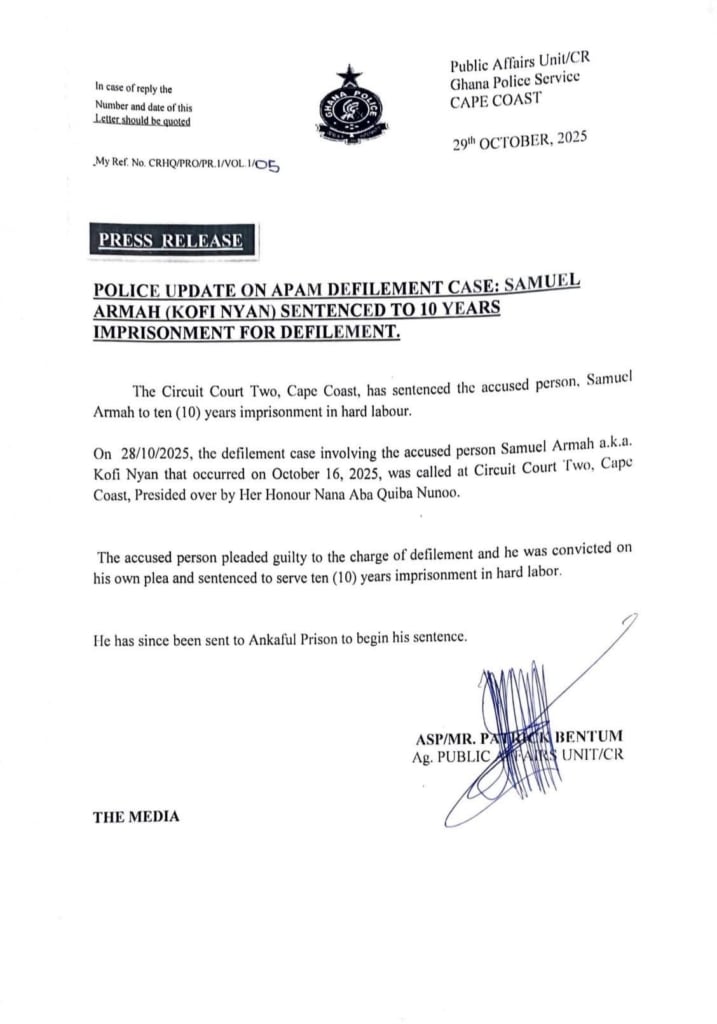 “On 28/10/2025, the defilement case … was called at Circuit Court Two, Cape Coast, presided over by Her Honour Nana Aba Quiba Nunoo. The accused person pleaded guilty to the charge of defilement and he was convicted on his own plea and sentenced to serve ten (10) years imprisonment in hard labour,” the statement said.