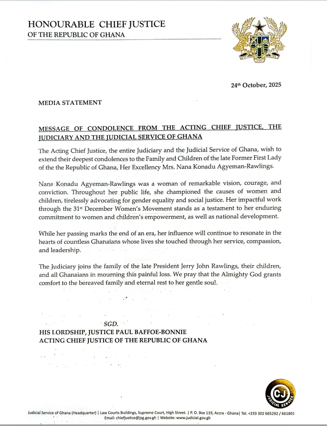 The Acting Chief Justice, His Lordship Justice Paul Baffoe-Bonnie, has extended a formal message of condolence to the family of the late former First Lady, Her Excellency Mrs. Nana Konadu Agyeman-Rawlings.