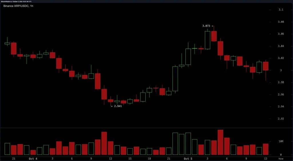 The 1-hour chart is dancing on a fine line between tactical precision and potential chaos. XRP is range-bound at the $3.00 level, tracing a descending channel that’s acting like a cranky doorman blocking entry to the VIP zone above. Bulls charged at $2.94 with a textbook V-shaped recovery, but the party hit resistance near $3.07—where sellers reappeared like bad exes at a reunion.
