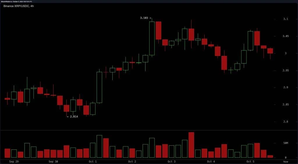 Over on the 4-hour chart, XRP appears to be hitting the snooze button after a brisk run-up. Price hit a high of $3.103 before pulling back, now loitering around $3.00 like it’s not sure whether to commit or ghost the rally altogether. Lower highs and lower lows are creeping in, hinting at short-term exhaustion. The volumes in retreat too—traders are either cautious or already on lunch. For the clever tactician, there are two options: play the breakout at $3.05 or the bounce off $2.95. Anything in between? That’s no-man’s land—avoid the drama.