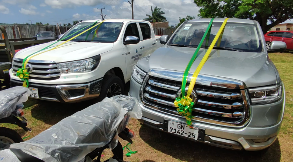 Ellembelle MP and Lands and Natural Resources Minister, Emmanuel Armah-Kofi Buah, has donated two pickup trucks and four motorbikes to the Ellembelle Police Command, the District Assembly, NADMO, Education Directorate, Environmental Health, and the Works Department respectively as well as presented several start-up equipment to artisans to commence their work after training.