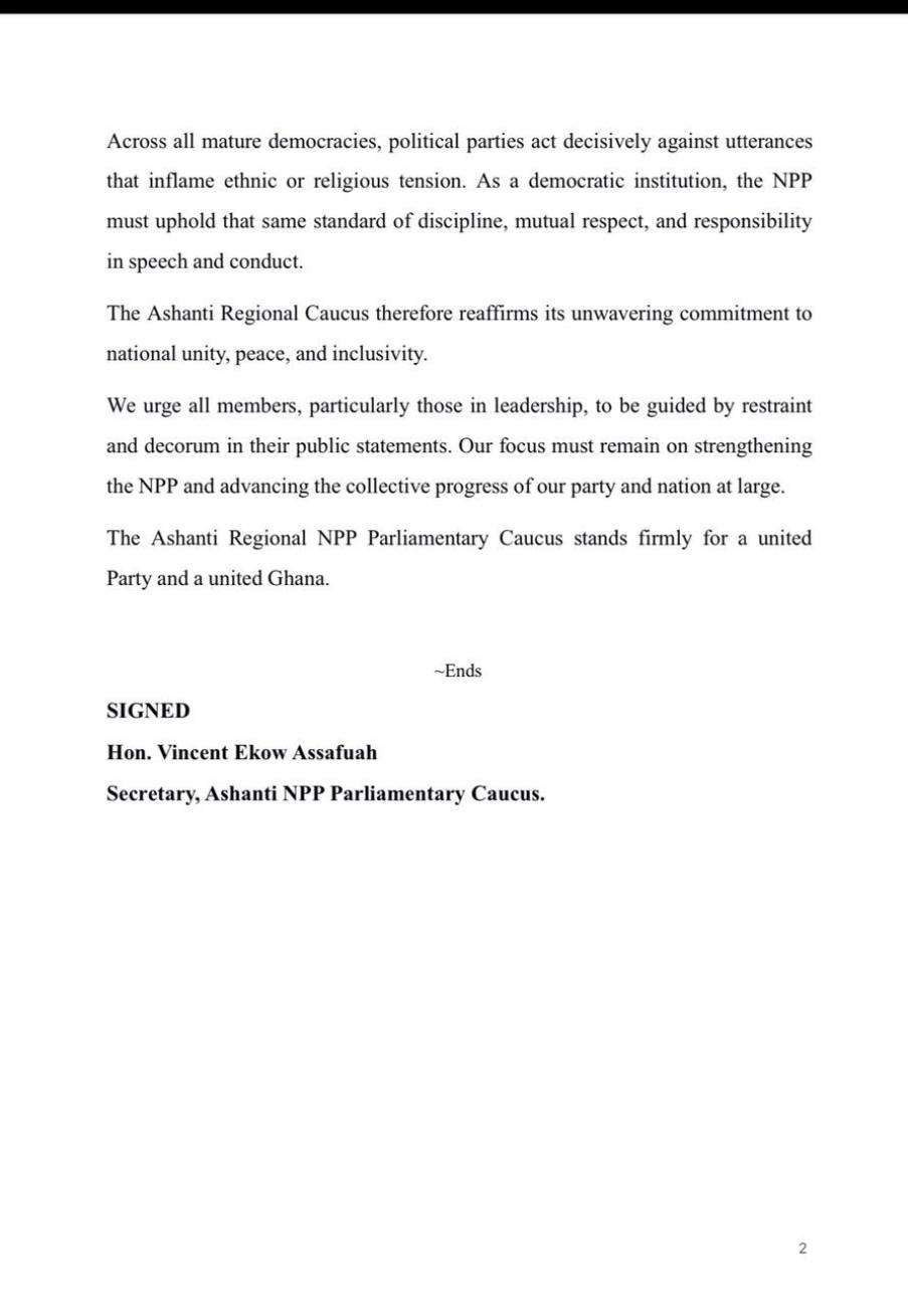 The Caucus reaffirmed its stance on unity and national cohesion. “The Ashanti Regional NPP Parliamentary Caucus stands firmly for a united Party and a united Ghana.”