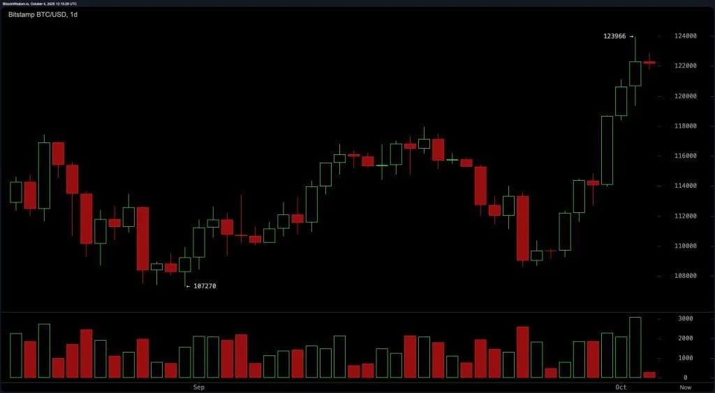 BTC/USD 1-day chart via Bitstamp on Oct. 4, 2025.