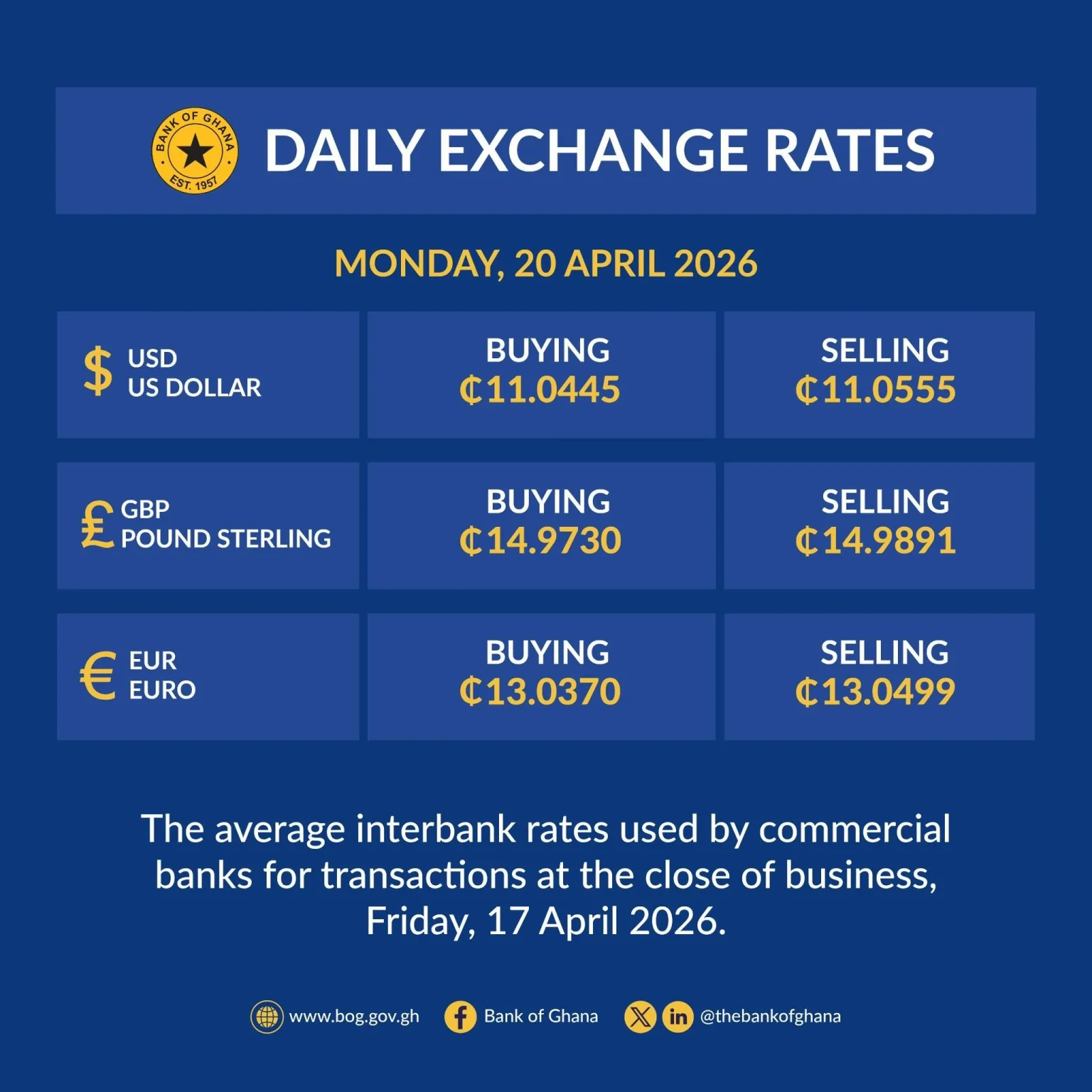 Per the rate from the Bank of Ghana (BoG) on Monday, April 20, the Cedi was buying at 11.0445 to a dollar. It was selling at 11.0555.