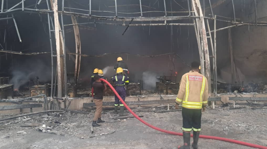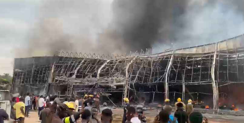 The fire, which began at the back of the mall, quickly engulfed the building, destroying shops selling groceries, electronics, and household items.