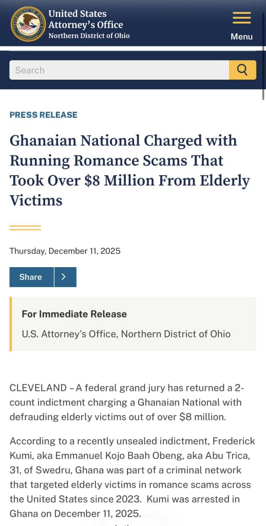 According to a recently unsealed indictment, Frederick Kumi, aka Emmanuel Kojo Baah Obeng, aka Abu Trica, 31, of Swedru, Ghana was part of a criminal network that targeted elderly victims in romance scams across the United States since 2023. Kumi was arrested in Ghana on December 11, 2025.
