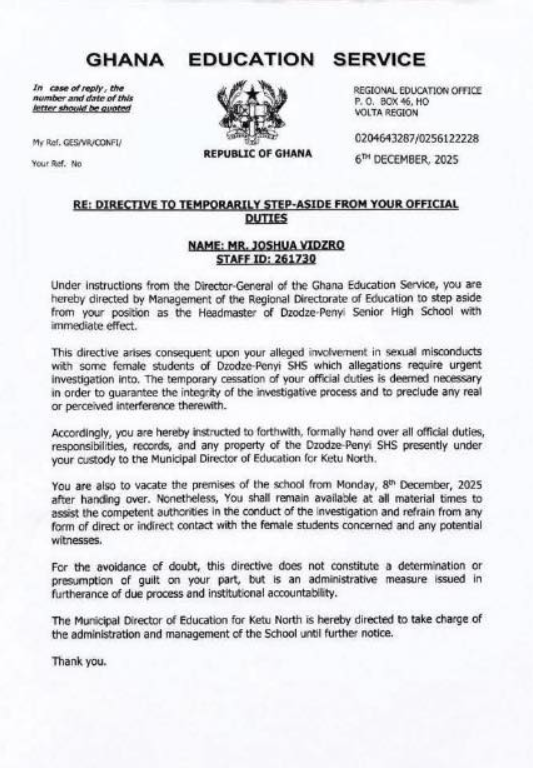 Mr. Vidzro has been instructed to formally hand over all official duties, responsibilities, records, and any property belonging to Dzodze-Penyi SHS that are under his custody to the Municipal Director of Education for Ketu North.
