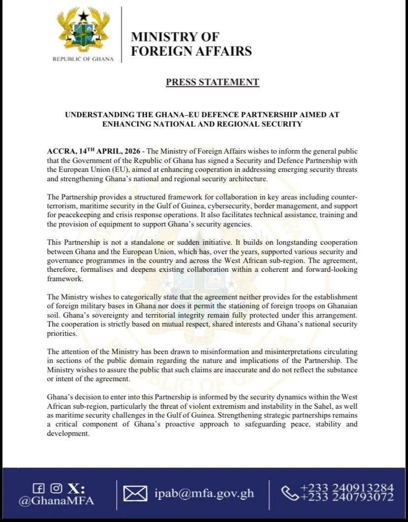 The Ministry of Foreign Affairs has announced that the Government of Ghana has entered into a Security and Defence Partnership with the European Union, aimed at strengthening cooperation to address emerging security threats and enhance national and regional stability.