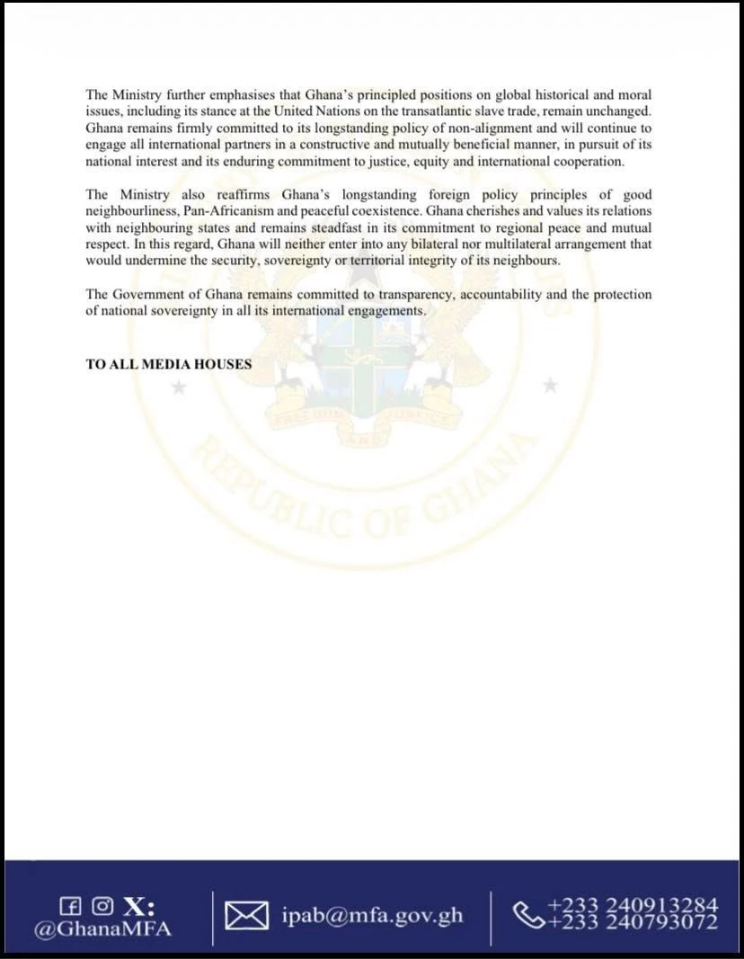 “The Ministry wishes to categorically state that the agreement neither provides for the establishment of foreign military bases in Ghana nor does it permit the stationing of foreign troops on Ghanaian soil. Ghana’s sovereignty and territorial integrity remain fully protected under this arrangement.
