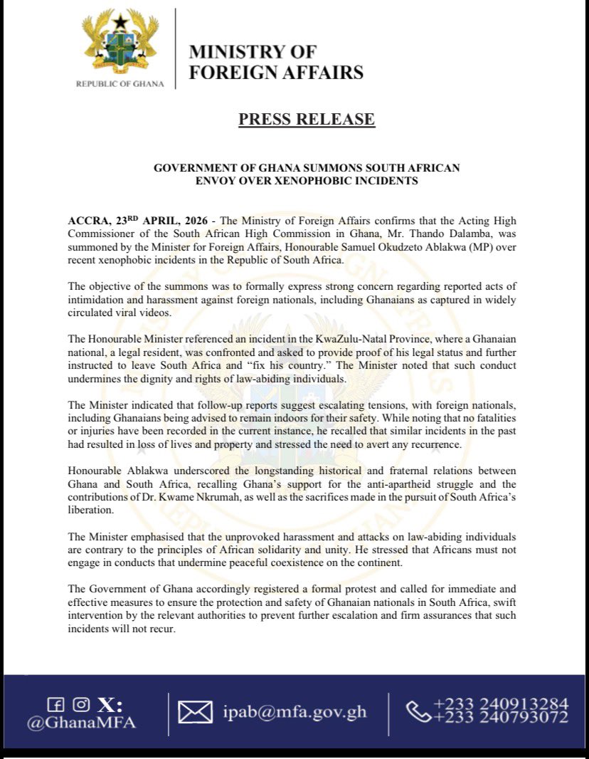 Ghana has summoned South Africa’s Acting High Commissioner, Thando Dalamba, over recent xenophobic attacks targeting foreign nationals, including Ghanaians, in a move signalling rising diplomatic tension.