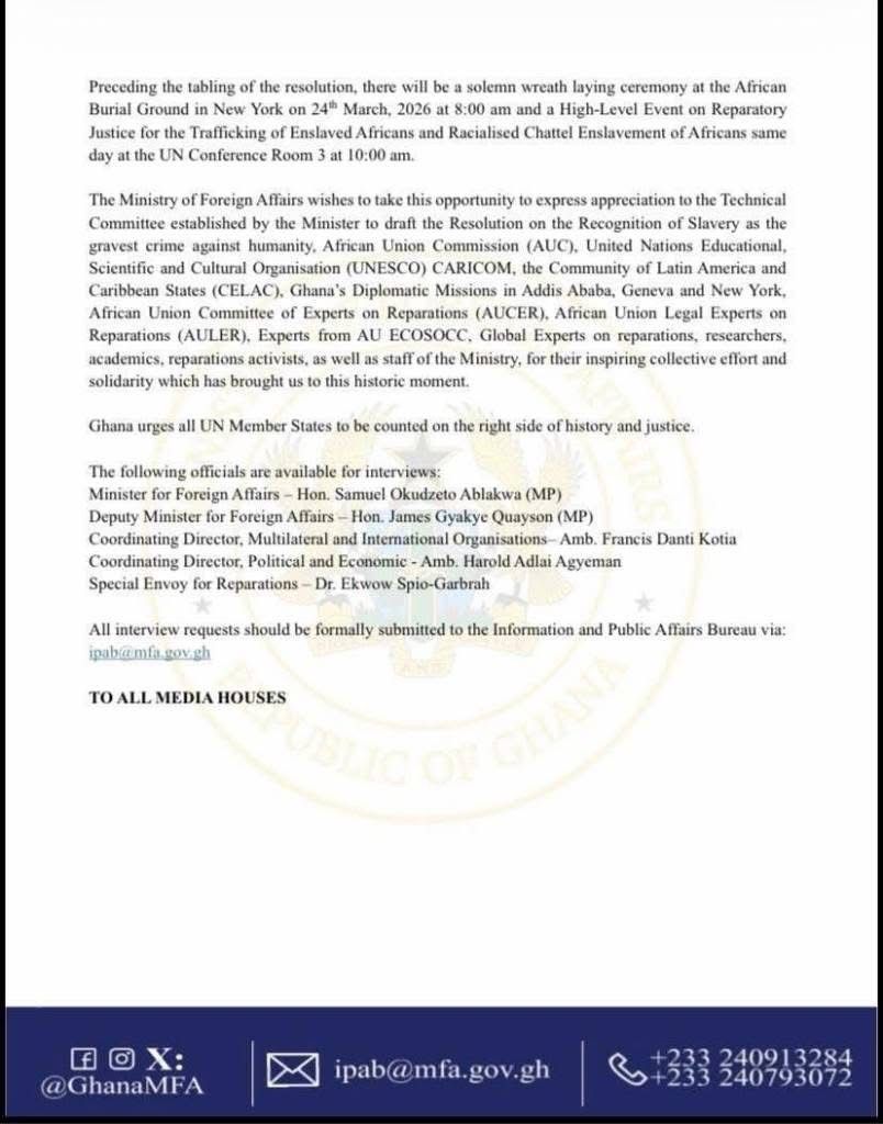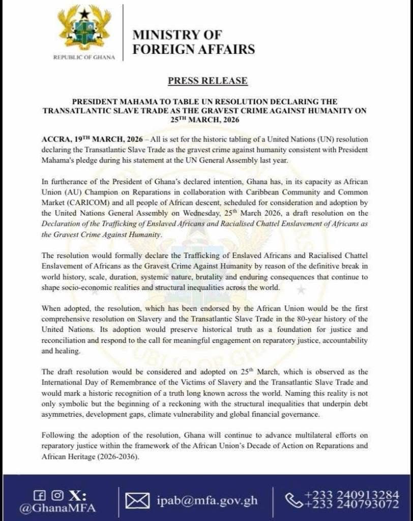 President John Mahama is set to table a landmark United Nations resolution on Wednesday, March 25, 2026, formally declaring the Transatlantic Slave Trade as the gravest crime against humanity, a move Ghana’s Ministry of Foreign Affairs describes as a defining moment in the global push for reparatory justice.
