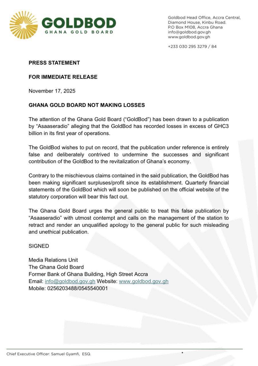 GoldBod also urged the public to disregard the report, calling on Asaase Radio to retract the story and issue an unqualified apology for what it described as a misleading and unethical publication.