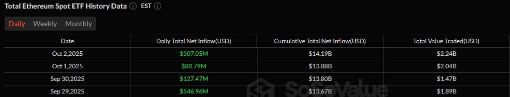 Smaller but notable contributions came from Vaneck’s ETHV ($3.30 million) and 21Shares’ TETH ($2.70 million). Total trading value stood at $2.24 billion, with net assets climbing to $30.19 billion.
