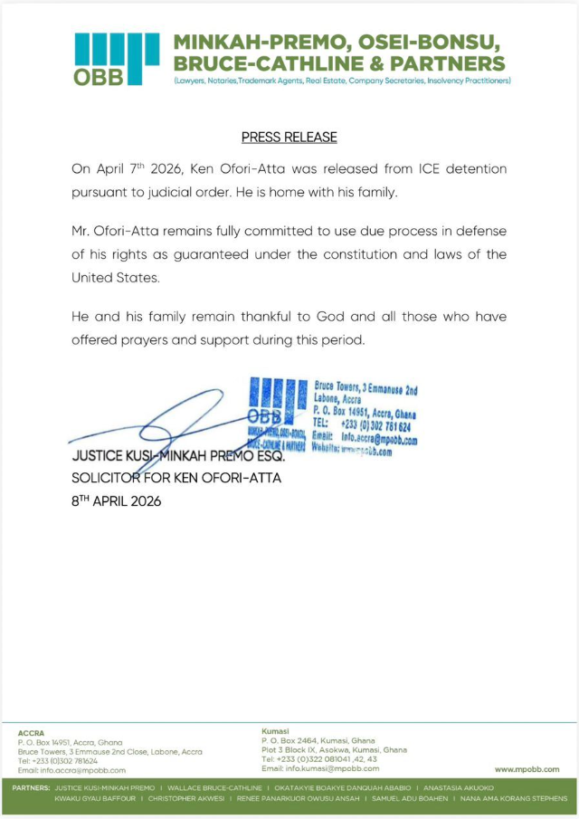 His legal team confirmed the development in a formal statement issued on April 8, 2026. Solicitor Justice Kusi-Minkah Premo of the firm Minkah-Premo, Osei-Bonsu, Bruce-Cathline & Partners handled the announcement. The former minister has now reunited with his family within the United States.