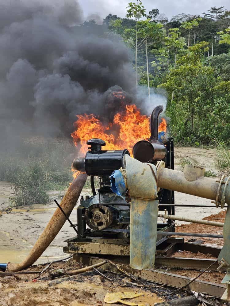 The team found four excavators, three of which had already been immobilised, while the fourth was disabled on-site. Investigators also discovered evidence of river diversion, two heavy-duty water pumps, and 12 makeshift mining structures, all of which were destroyed.