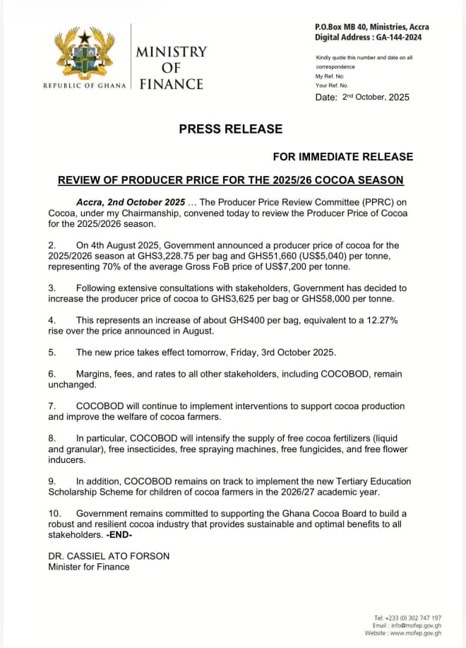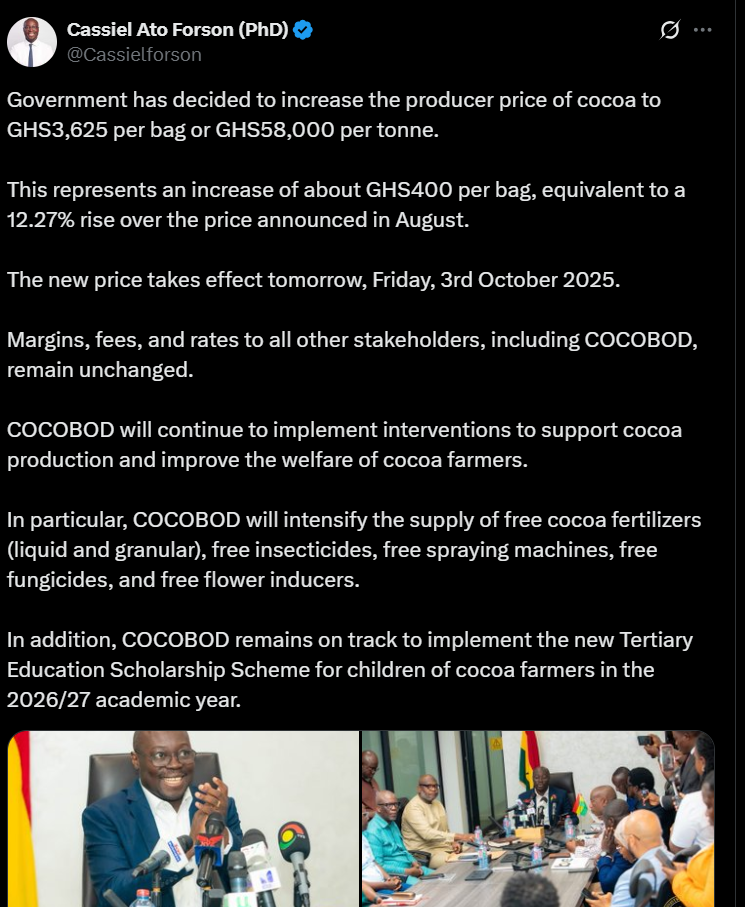 The Minister of Finance, Dr Cassiel Ato Forson, announced on Thursday, October 2, that the government has decided to increase the producer price of cocoa to GHS3,625 per bag or GHS58,000 per tonne.