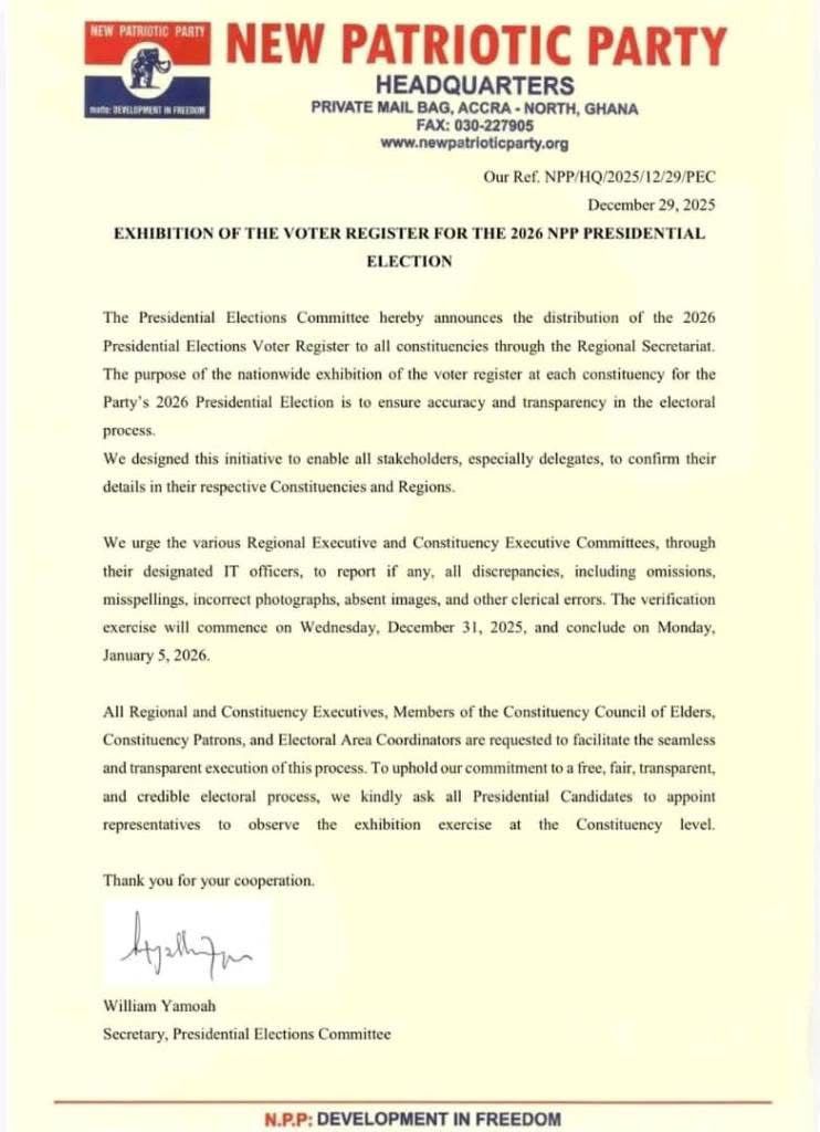 According to the statement dated December 29, 2025 and signed by William Yamoah, Secretary of the Presidential Elections Committee, the exhibition exercise is intended to give party stakeholders, particularly delegates, the opportunity to verify their details in their respective constituencies and regions.