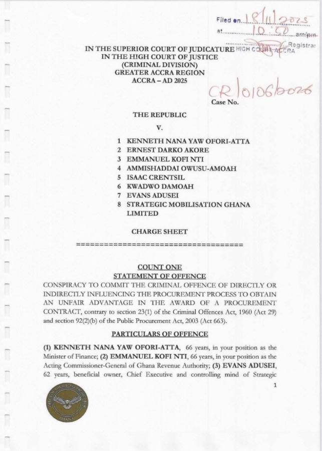 The High Court of Justice, Criminal Division, has formally filed a criminal charge sheet against former Finance Minister Ken Ofori-Atta and seven others, including Ernest Darko Akore, Emmanuel Kofi Nti, Ammishaddai Owusu-Amoah, Isaac Crentsil, Kwadwo Damoah, Evans Adusei, and Strategic Mobilisation Ghana Limited (SML).