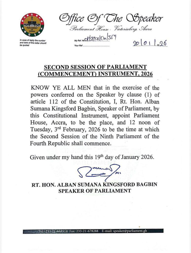 Speaker of Parliament, Alban Bagbin, has issued a Constitutional Instrument to commence the Second Session of the Ninth Parliament of the Fourth Republic.
