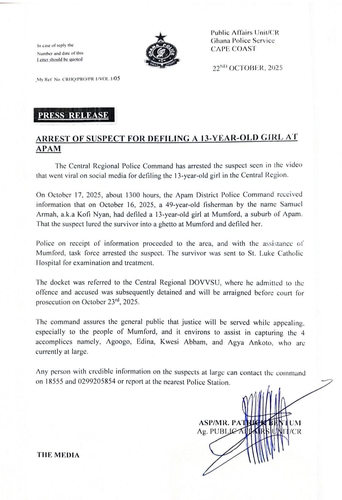The Central Regional Police Command has arrested a 49-year-old fisherman identified as Samuel Armah, also known as Kofi Nyan, for allegedly defiling a 13-year-old girl at Mumford, a suburb of Apam.