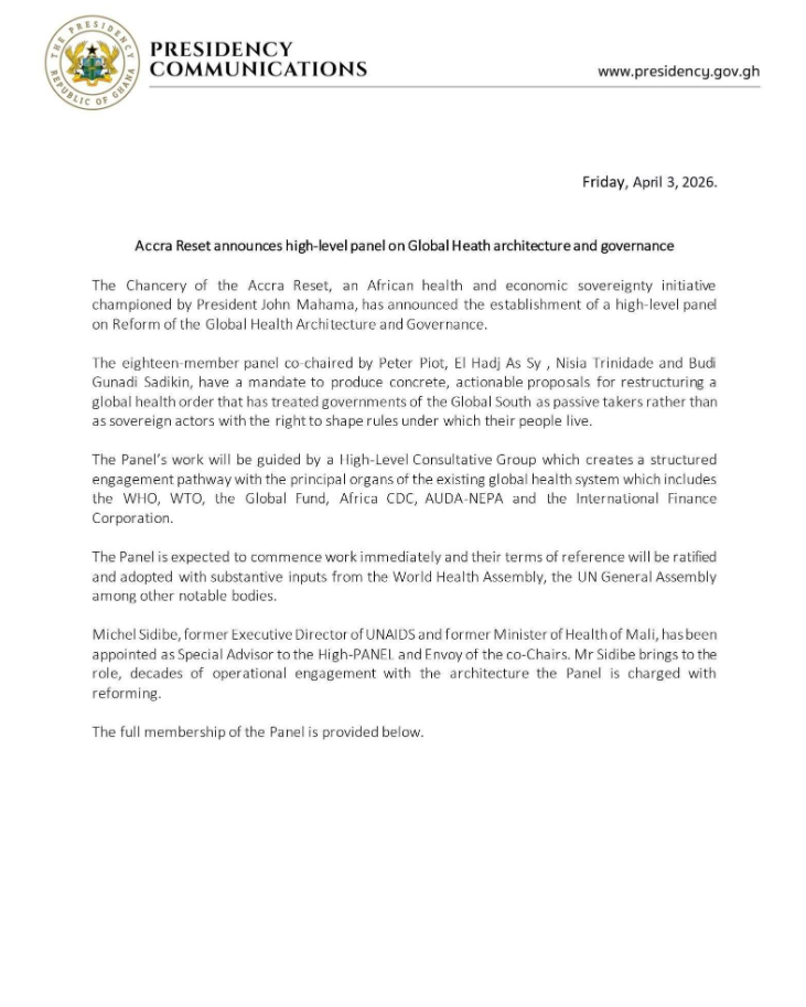 The Chancery of the Accra Reset, an African health and economic sovereignty initiative championed by President John Dramani Mahama, has announced a high-level panel of the Accra Reset Initiative tasked with reforming the global health architecture and governance system.