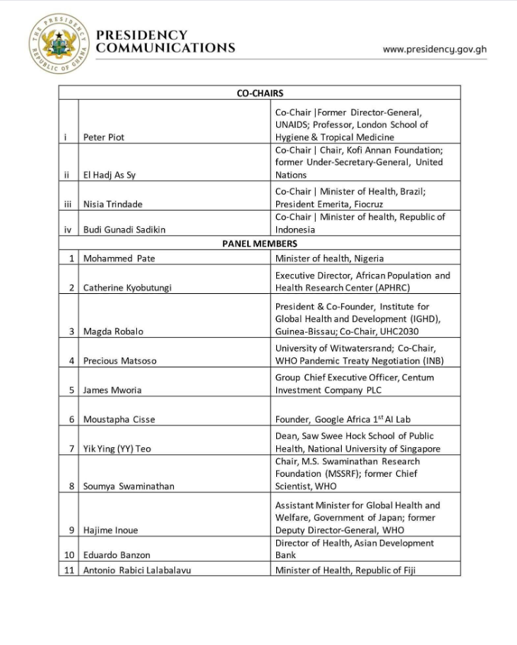Notable panel members include Mohammed Pate, Nigeria’s Minister for Health; John Nkengasong, Executive Director of the MasterCard Foundation and former Director of Africa CDC; and Soumya Swaminathan, former Chief Scientist of WHO.