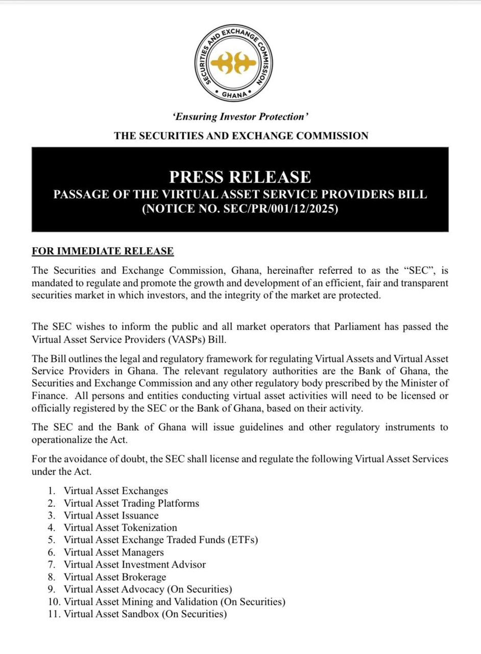 The SEC and the Bank of Ghana will issue guidelines and other regulatory instruments to operationalise the Act.