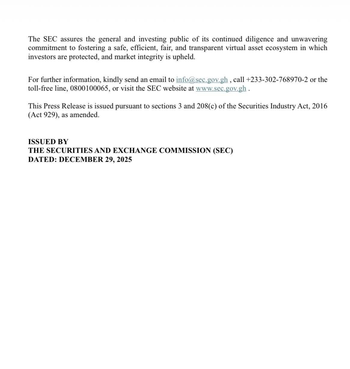 This was announced by Acting Deputy Director-General of the Securities and Exchange Commission, Mensah Thompson in a statement on his Facebook page, Tuesday December 30.
