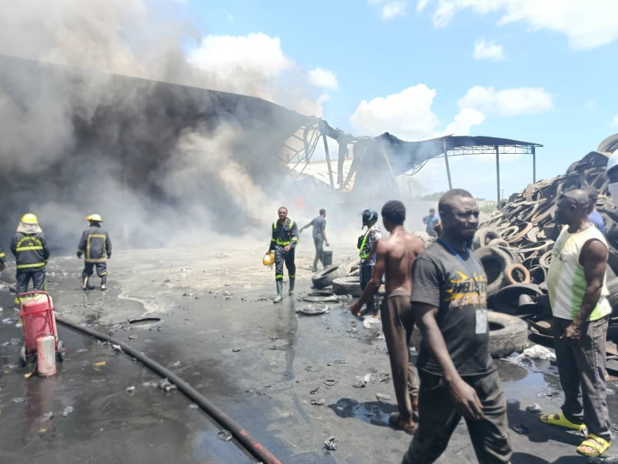 According to the GNFS, the fire was confined by 12:55 p.m., brought under control by 8:08 p.m., and completely extinguished at 10:39 p.m. An excavator was later deployed to assist in separating heaps of burning tyres during the overhaul process.
