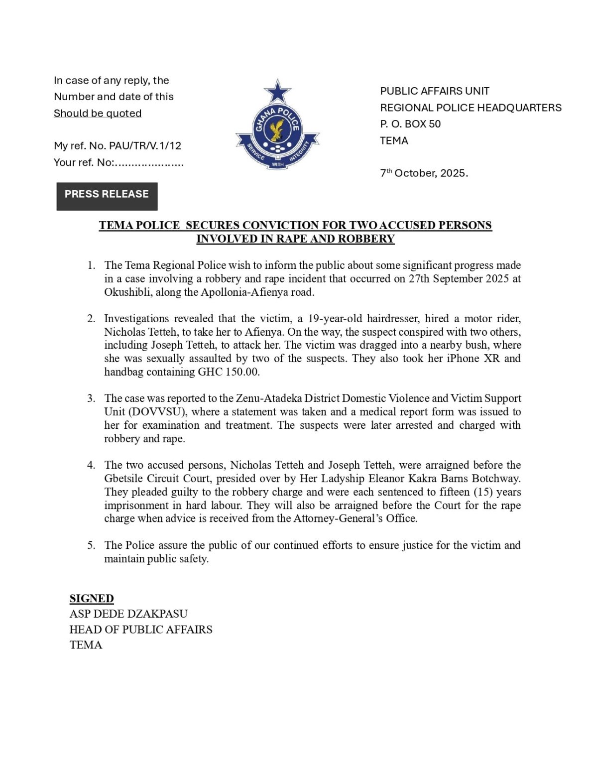 The Tema Regional Police have announced the conviction of two men involved in a brutal rape and robbery case that occurred along the Apollonia–Afienya road on September 27, 2025.