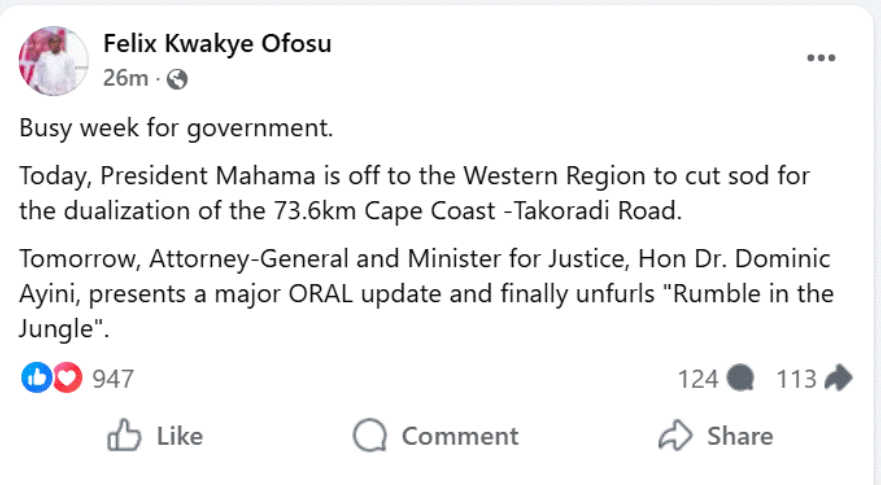 In a Facebook post, Mr Kwakye Ofosu said, “…Attorney-General and Minister for Justice, Hon Dr. Dominic Ayini, presents a major ORAL update and finally unfurls ‘Rumble in the Jungle’.”